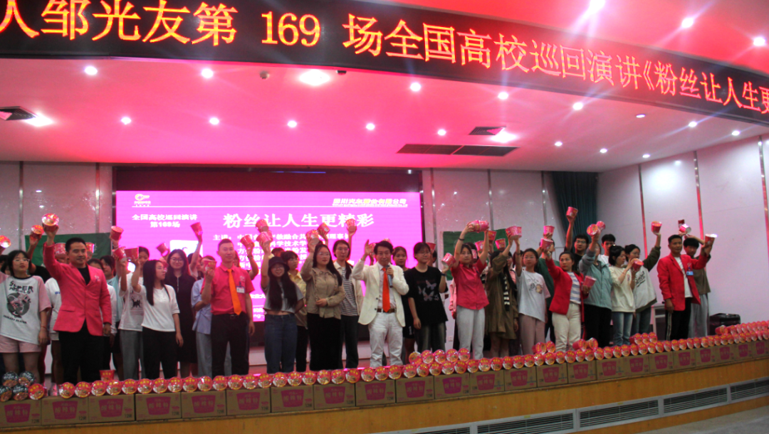 下午三時(shí)許,中國食品產(chǎn)教融合共同體副理事長(cháng)、中國食品科學(xué)技術(shù)學(xué)會(huì )理事、方便粉絲方便米粉發(fā)明人、方便粉絲專(zhuān)家、教授級高工、新中國成立60年“三農”模范人物、光友薯業(yè)創(chuàng )始人、光友薯業(yè)董事長(cháng)鄒光友在四川農業(yè)大學(xué)食品學(xué)院如期舉行全國高校巡回演講第169場(chǎng)——《粉絲讓人生更精彩》,這場(chǎng)關(guān)于創(chuàng )業(yè)的勵志演講大獲成功,近700人的禮堂現場(chǎng)一片歡騰,在座師生和直播間的觀(guān)眾無(wú)不受益良多。