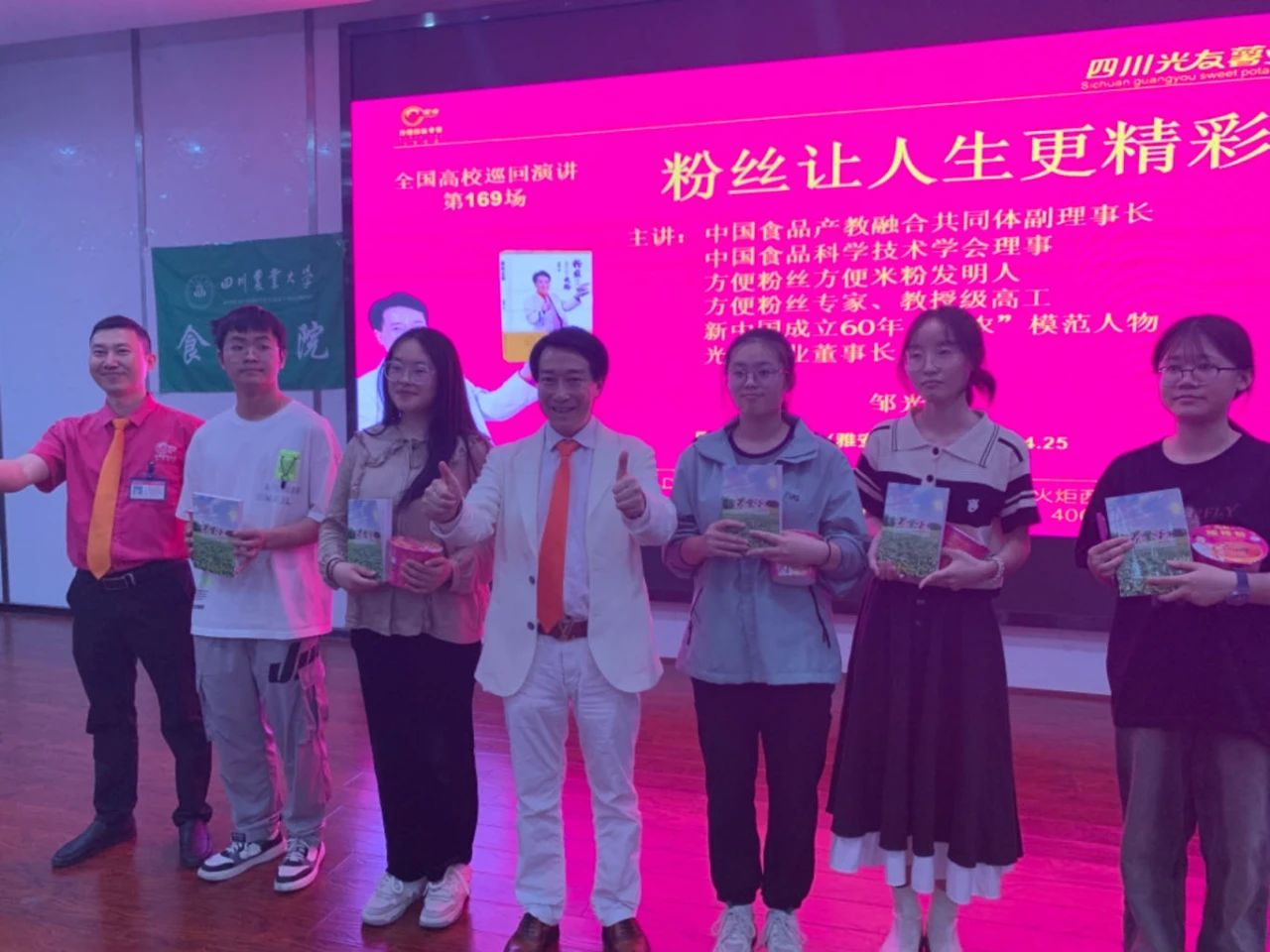 4月25日,陽(yáng)光曜靈,和風(fēng)容與。正是麗日當空時(shí),光友薯業(yè)走進(jìn)了綠意盎然、洋溢著(zhù)青春活力的四川農業(yè)大學(xué)食品學(xué)院,開(kāi)展了校企深化合作交流座談會(huì ),組織考察校區各食堂、超市,中國食品產(chǎn)教融合共同體副理事長(cháng)、中國食品科學(xué)技術(shù)學(xué)會(huì )理事、方便粉絲方便米粉發(fā)明人、方便粉絲專(zhuān)家、教授級高工、新中國成立60年“三農”模范人物、光友薯業(yè)創(chuàng )始人、光友薯業(yè)董事長(cháng)鄒光友鄒光友成功舉行了全國高校第169場(chǎng)創(chuàng )業(yè)勵志演講。