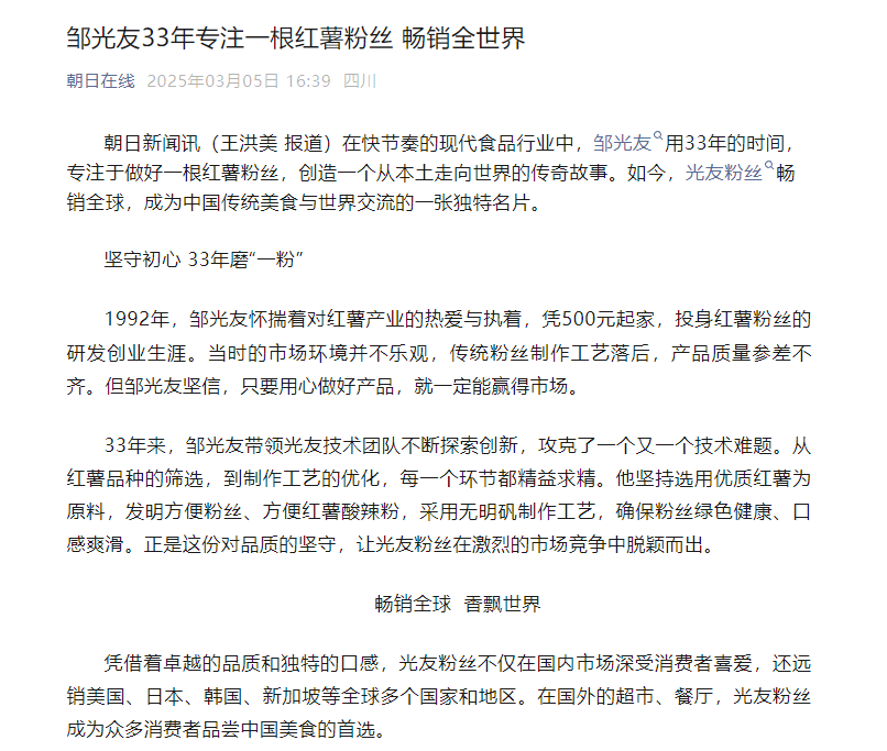 轉載朝日在線(xiàn)——鄒光友33年專(zhuān)注一根紅薯粉絲 暢銷(xiāo)全世界