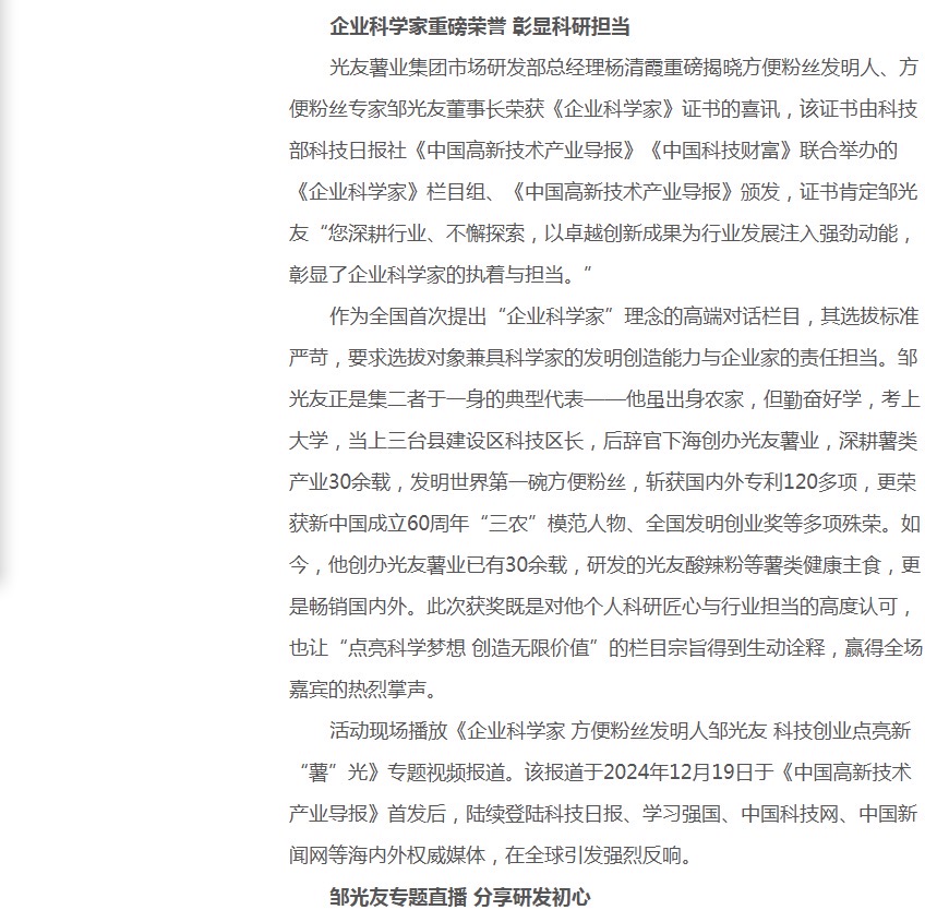 方便粉絲發(fā)明人鄒光友獲企業(yè)科學(xué)家榮譽(yù)稱(chēng)號