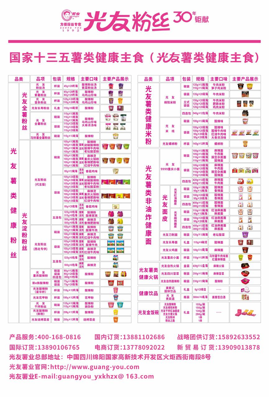 光友薯業(yè)在中國乃至世界把紅薯、馬鈴薯做成一大健康主食產(chǎn)業(yè),實(shí)現了薯業(yè)產(chǎn)業(yè)化,發(fā)展成為全球知名企業(yè)。連續十屆被國家八部委評定為“農業(yè)產(chǎn)業(yè)化國家重點(diǎn)龍頭企業(yè)”,同時(shí)多次獲得“國家高新技術(shù)企業(yè)”、“全國主食加工業(yè)示范企業(yè)”、“全國馬鈴薯主食化產(chǎn)業(yè)十大領(lǐng)軍企業(yè)”、“全國守合同重信用企業(yè)”、“推進(jìn)甘薯產(chǎn)業(yè)發(fā)展突出貢獻獎”、“四川省科學(xué)技術(shù)進(jìn)步獎一等獎”等殊榮?!肮庥逊劢z”榮獲中國名牌、“光友商標”被評定為“中國馳名商標”。光友薯業(yè)獲120余項國際國內專(zhuān)利,國際國內商標180余個(gè);光友方便粉絲獲得美國FDA認證,成為出口美國、日本免檢食品。光友酸辣粉、光友綿陽(yáng)米粉、光友紅油面皮、光友方便火鍋等120種薯類(lèi)方便主食,暢銷(xiāo)北京等全國各地市場(chǎng),暢銷(xiāo)美國、日本、英國等國際市場(chǎng),光友薯類(lèi)方便主食,方便全世界!